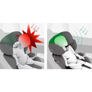 Patentierte, neigungsverstellbare Kopfstütze: Die patentierte, neigungsverstellbare Kopfstütze unterstützt dabei, den Kopf des Kindes in einer etwas nach hinten geneigten Position zu halten. Damit schützt sie davor, dass der Kopf im Schlaf nach vorne fällt. Im Falle eines Seitenaufpralls soll der Kopf so in einer geschützten Position verbleiben – dies ist 7x sicherer als wäre er aus der sicheren Zone des Sitzes gefallen*. Drei verschiedene Einstellungen bieten optimalen Komfort – egal, ob Euer Kind wach ist oder schläft.