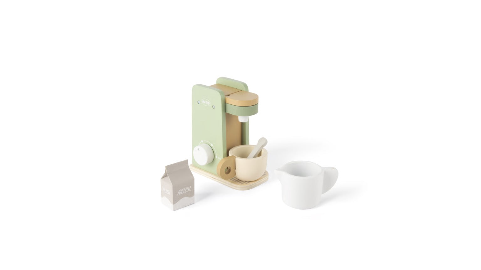 Das Set besteht aus einer wunderschön gestalteten Kaffeemaschine in Mintgrün-Nuancen sowie passendem Zubehör, das das Kaffeebereiten zu einem vollständigen Erlebnis macht. Die natürlichen Materialien verleihen dem Spielzeug eine warme und angenehme Haptik, während die abgerundeten Kanten sicheres Spielen gewährleisten. Die robuste Konstruktion ist besonders geeignet für den Einsatz in Einrichtungen, wo viele kleine Barista-Talente sich entfalten können.