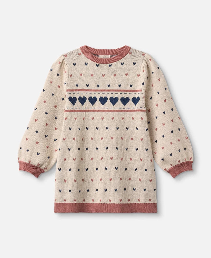 Ansprechender Fliink Kleid in stickat mit einem Muster aus kleinen Herzen in Rosa- und Nuancen. Das Fliink Kleid hat lange Ärmel und einen Rund Ausschnitt. Ein breiter Streifen mit blauen Herzen ziert die Vorderseite, während die Ränder mit einem kontrastierenden rosa gerippter Rand versehen sind.