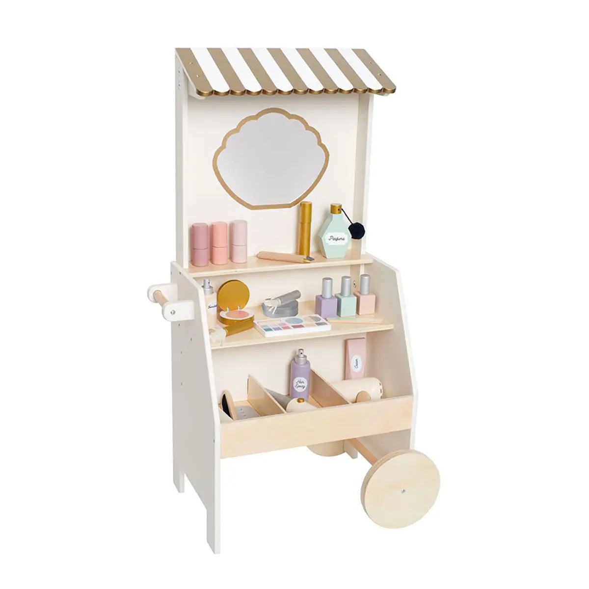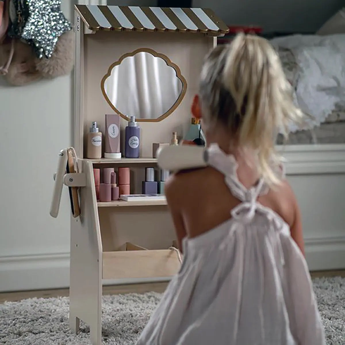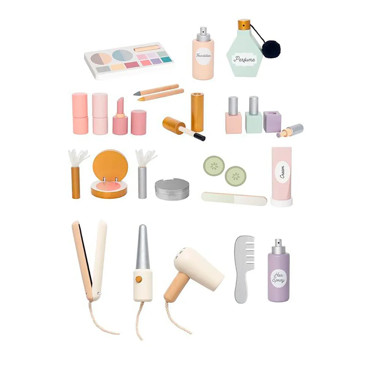 Jetzt kannst du dich um die Haare kümmern, style sie mit Föhn, Glätteisen oder Lockenstab und am Ende fixierst du die tolle Frisur mit Haarspray. Ein exklusives Parfum darf zum Schluss nicht fehlen. Dein Kunde kann sich nach deiner Behandlung im Spiegel von deiner Behandlung und dem tollen Resultat überzeugen. Alle Accessoires sind aus Holz und der Beauty Salon hat Räder und einen Griff, um ihn leicht zu bewegen. Auf den beiden Regalen finden alle Beauty-Produkte Platz. 26 verschiedene luxuriöse Accessoires sind enthalten. Ein stundenlanger Spielspaß ist garantiert, bei dem kreative Rollenspiele gefördert werden und der Fantasie keine Grenzen gesetzt sind.