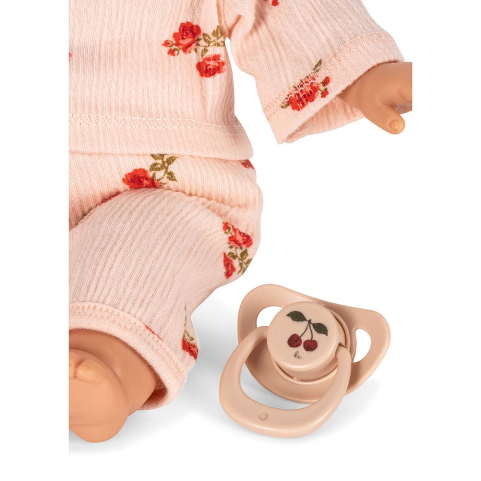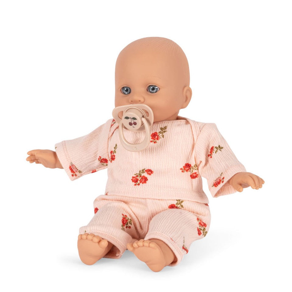 Hübsche Vinylpuppe, die mit einem zweiteiligen Baumwollset sowie einem Schnuller geliefert wird. Die Kleidung lässt sich vom Kind leicht an- und ausziehen.