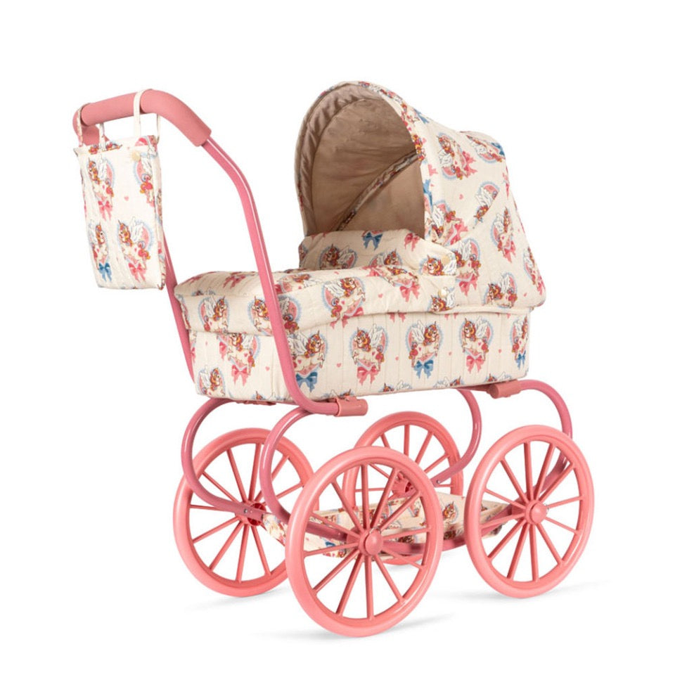 Retro-inspirierter Puppenwagen in einer kleineren Version, die für kleine Kinder leicht zu manövrieren ist. Er ist mit vier großen Rädern ausgestattet, die ihn stabil und leichtgängig machen.