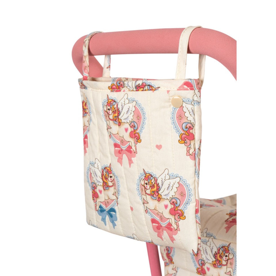 Der Puppenwagen verfügt über ein klappbares Verdeck und einen gepolsterten Aufbewahrungskorb unter der Tragetasche. Das Gestell besteht aus Metall mit weichen Schaumstoffgriffen. Wird vollständig montiert geliefert und lässt sich leicht zusammenklappen und verstauen.