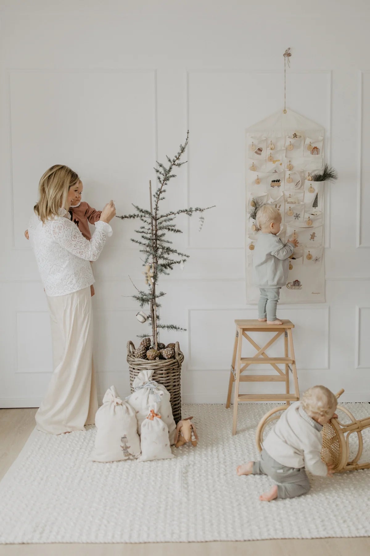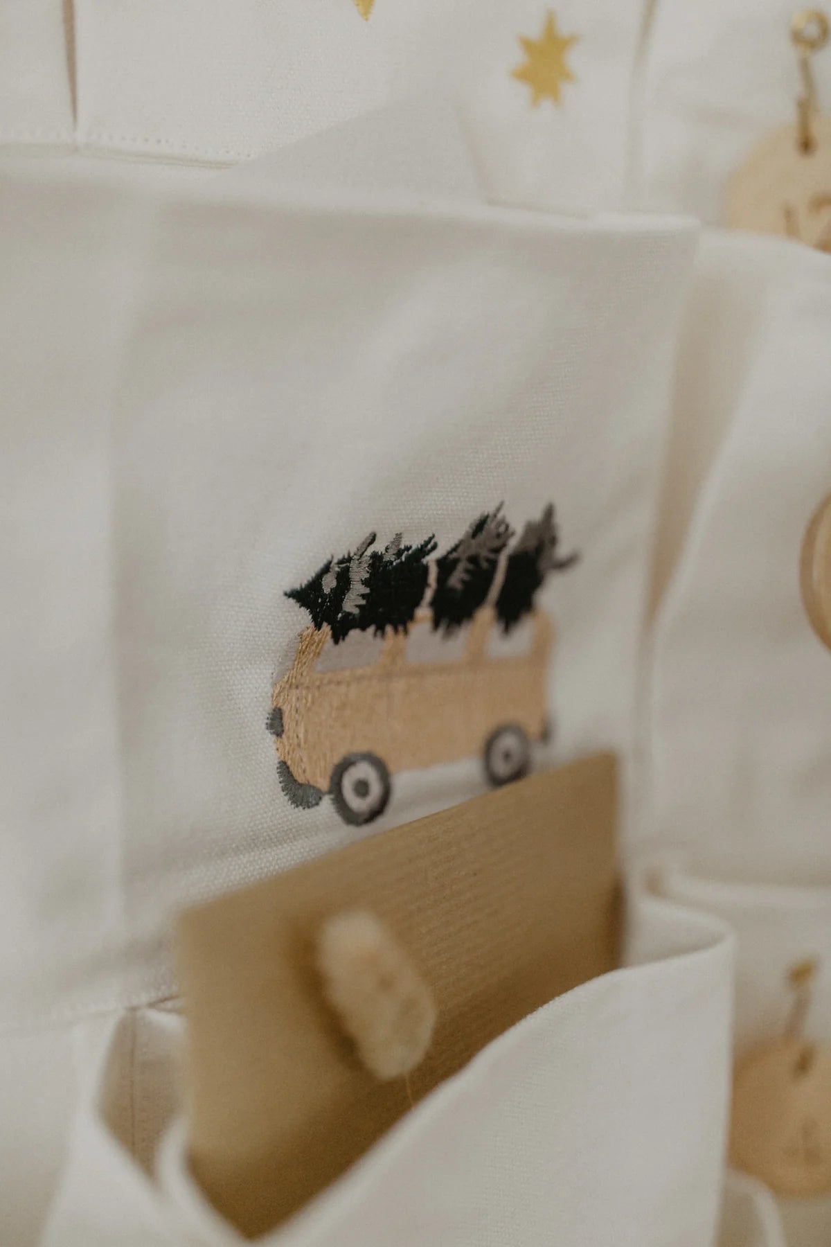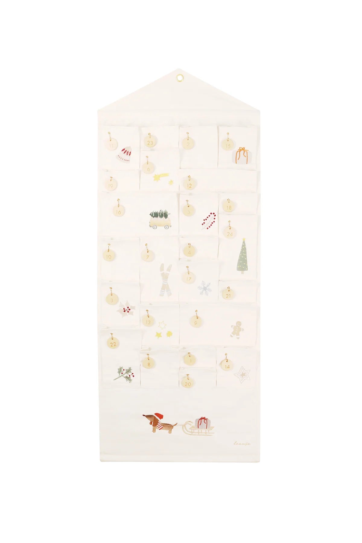 Lieferumfang: Adventskalender wird gerollt geliefert. Enthalten sind zwei integrierte Holzstangen und ein extra Stoffbeutel, der die Metallhaken und Holzplättchen beinhaltet.