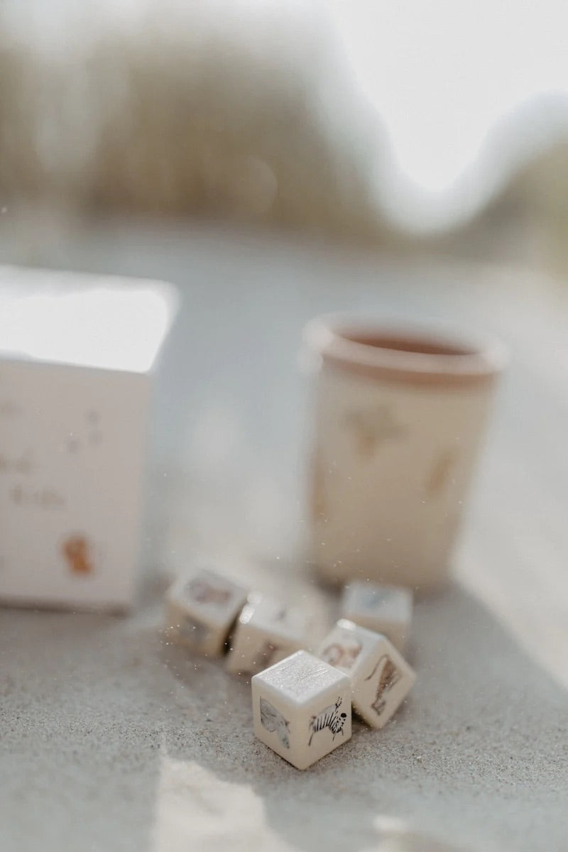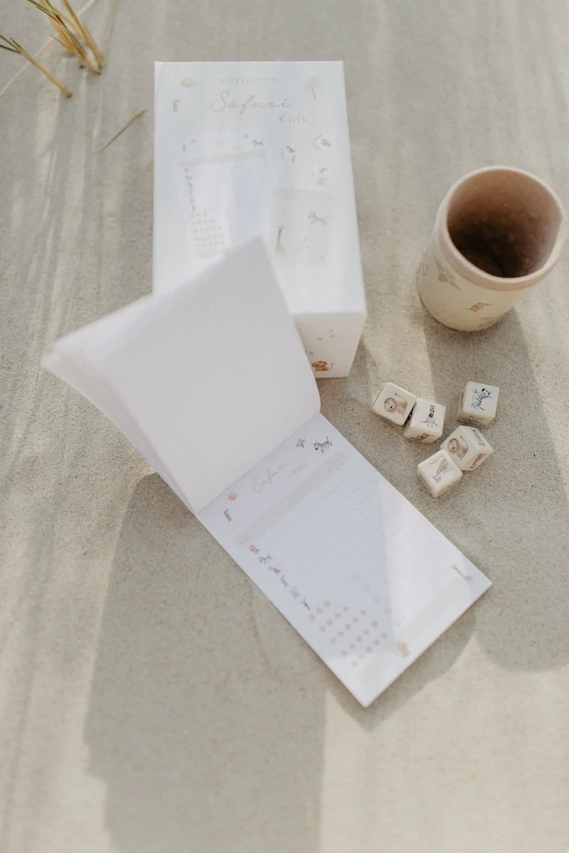 SAFARI KIDS begeistert mit einer liebevollen Gestaltung, inklusive handgemalter Illustrationen auf Papier, Würfeln und Eurem Safari-Würfelbecher.