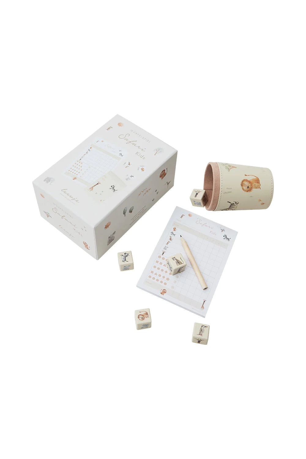 - Lieferumfang: 5 Holzwürfel mit Tiermotive, 1 Safari-Würfelbecher, 1 Spielblock (á 40 Blatt), 1 Bleistift