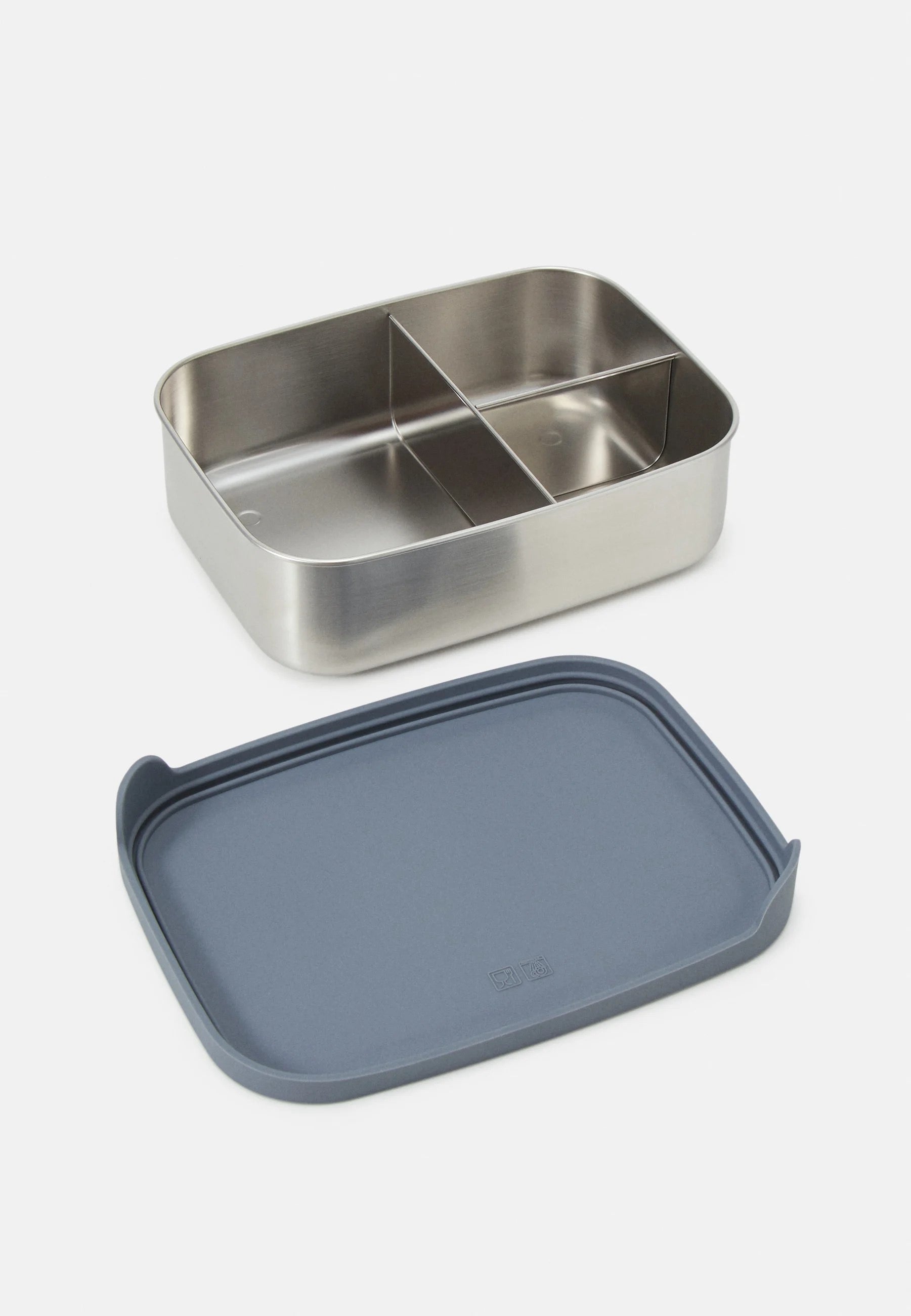 Eine leichte Brotdose aus Edelstahl mit einem süßen Silikondeckel, die in drei praktische Fächer unterteilt ist.