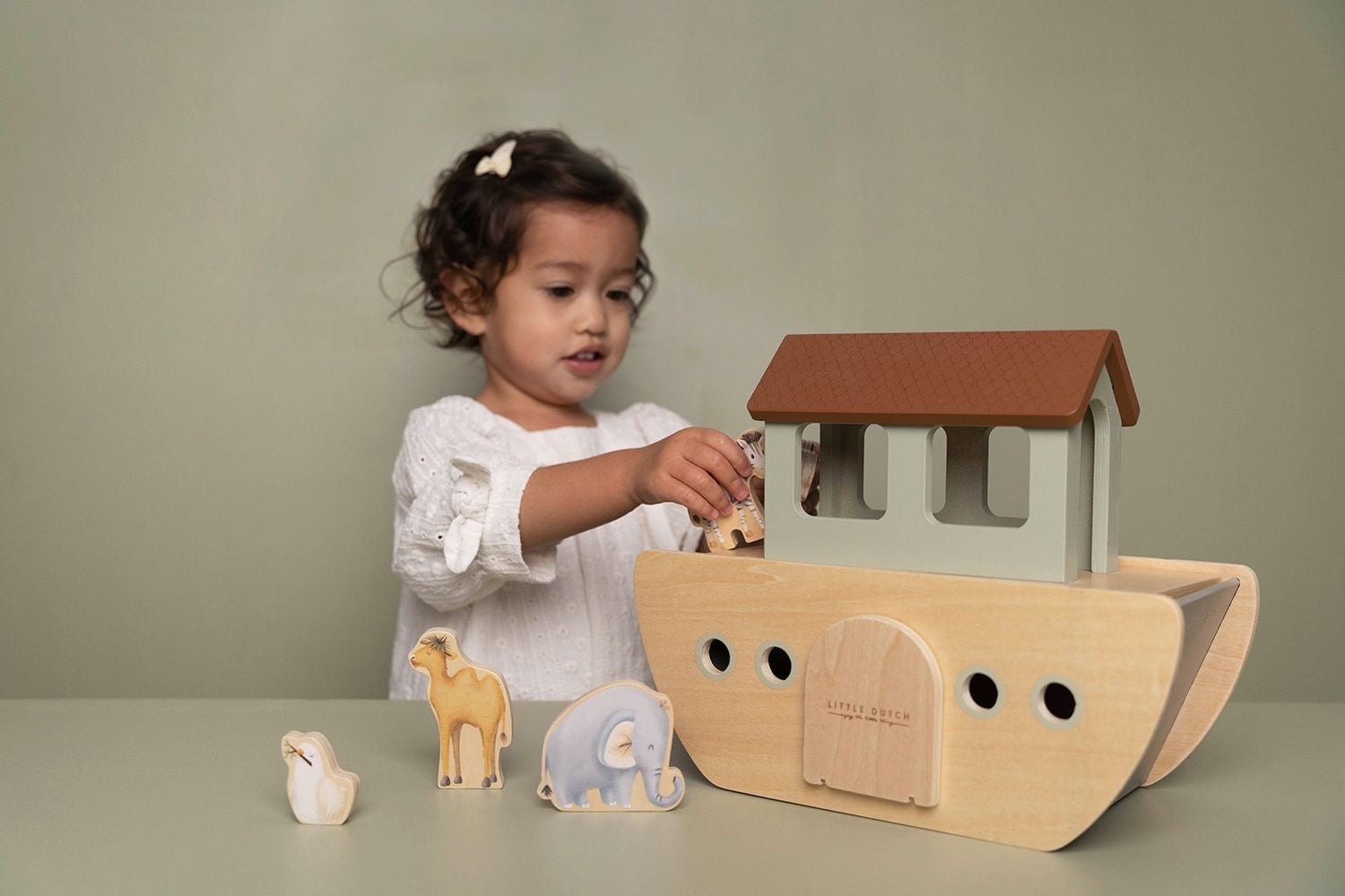 Spielen Sie die Geschichte der Arche Noah mit diesem schönen Spielset nach. Hilf den Tieren, sich gegenseitig zu finden und sie für ihre Reise vorzubereiten. Jeder Passagier hat einen gleichwertigen Freund, mit dem er reisen kann. Dieses 31-teilige Set enthält die Arche mit einer Tür und einem Deck, das herausgenommen werden kann, um alle Tiere an Bord zu bringen. Noah nimmt seine Frau und eine große Gruppe von Tieren mit auf die Reise über den Ozean: 2 Tauben, Hühner, Hähne, 2 Schildkröten, 2 Affen, ein Löwe und eine Löwin, 2 Strauße, 2 Tiger, eine Kuh, ein Stier, 2 Krokodile, 2 Giraffen, 2 Eisbären, 2 Zebras, 2 Elefanten, 2 Kamele. Dieses Arche Noah-Spielset fördert das Rollenspiel und verbessert die Vorstellungskraft und den Wortschatz, während Ihr Kind diese klassische Geschichte kennenlernt.