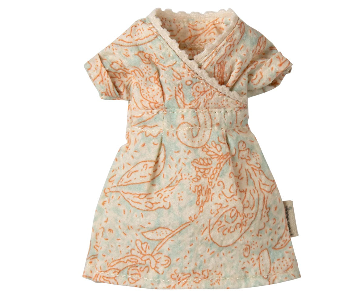 Ein klassischer Maileg-Artikel; Mama Maus in einem hellen Kleid. Diese Maus passt zu Möbeln und Accessoires in der Größe Maus. Kaufe mehr Kleidung separat. Kleidung in Größe Mama/Papa passt zu dieser Maus.