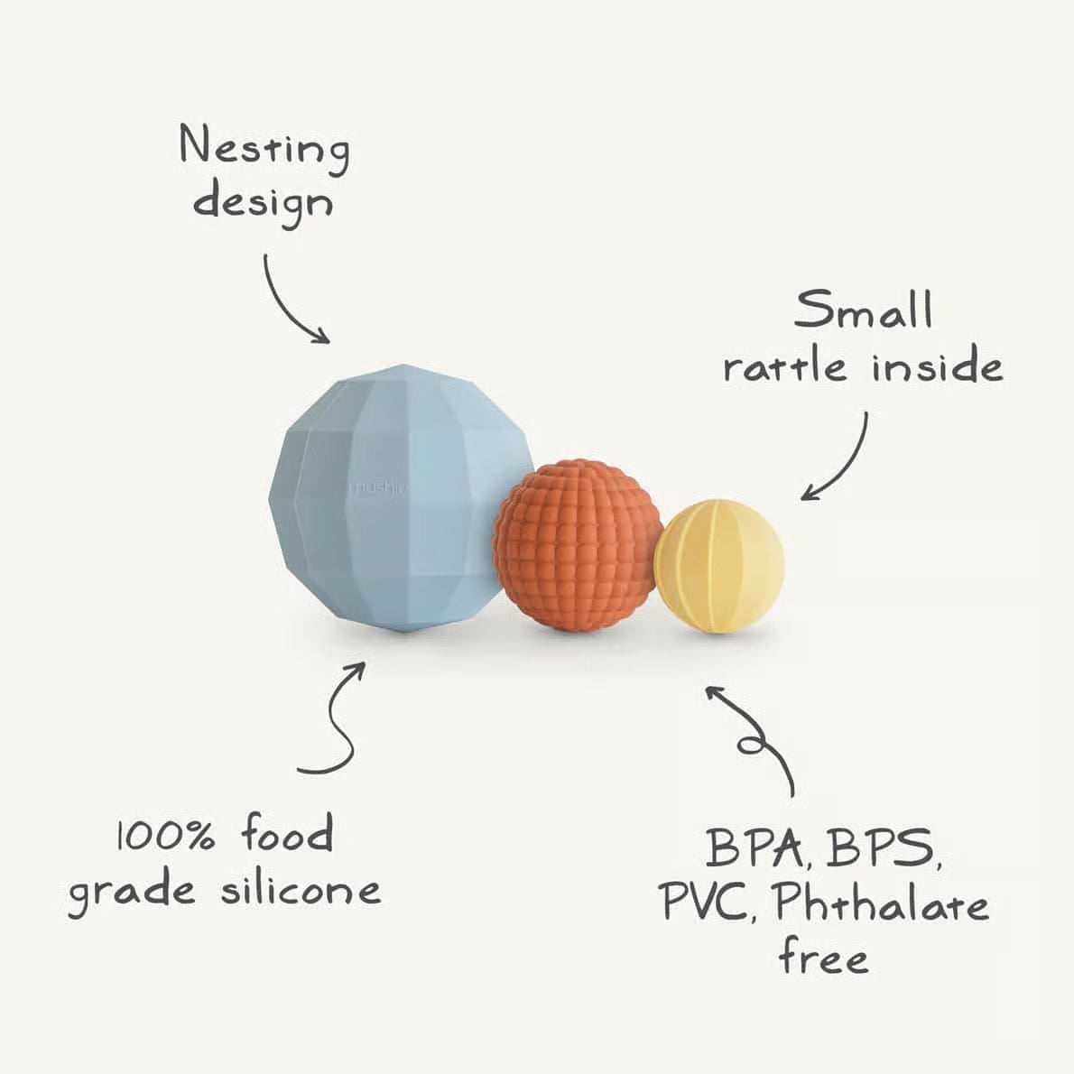 Das Nesting-Design ermöglicht es, die Kugeln ineinander zu stapeln, was das räumliche Bewusstsein und die Koordination fördert. Die kleinste der drei Kugeln erzeugt ein sanftes Rasselgeräusch, das beruhigend und spannend für die Ohren des Babys ist. Hergestellt aus weichem, ungiftigem, lebensmittelechtem Silikon, ist dieses Spielzeug sicher und leicht zu reinigen, ideal für zu Hause oder unterwegs.