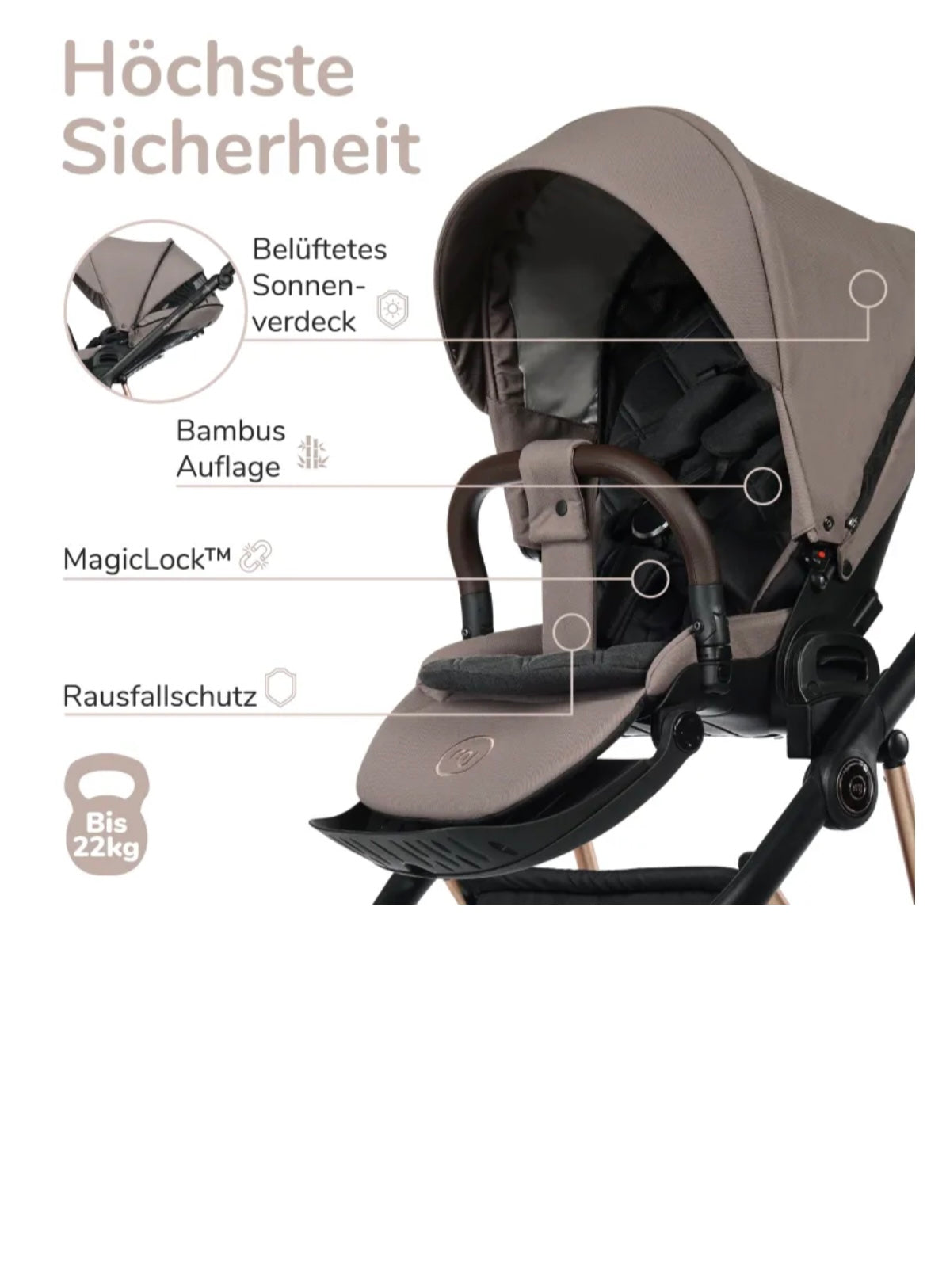 - 5-Punkt-Gurt mit Magnetverschluss: Einhändig bedienbar und sicher.