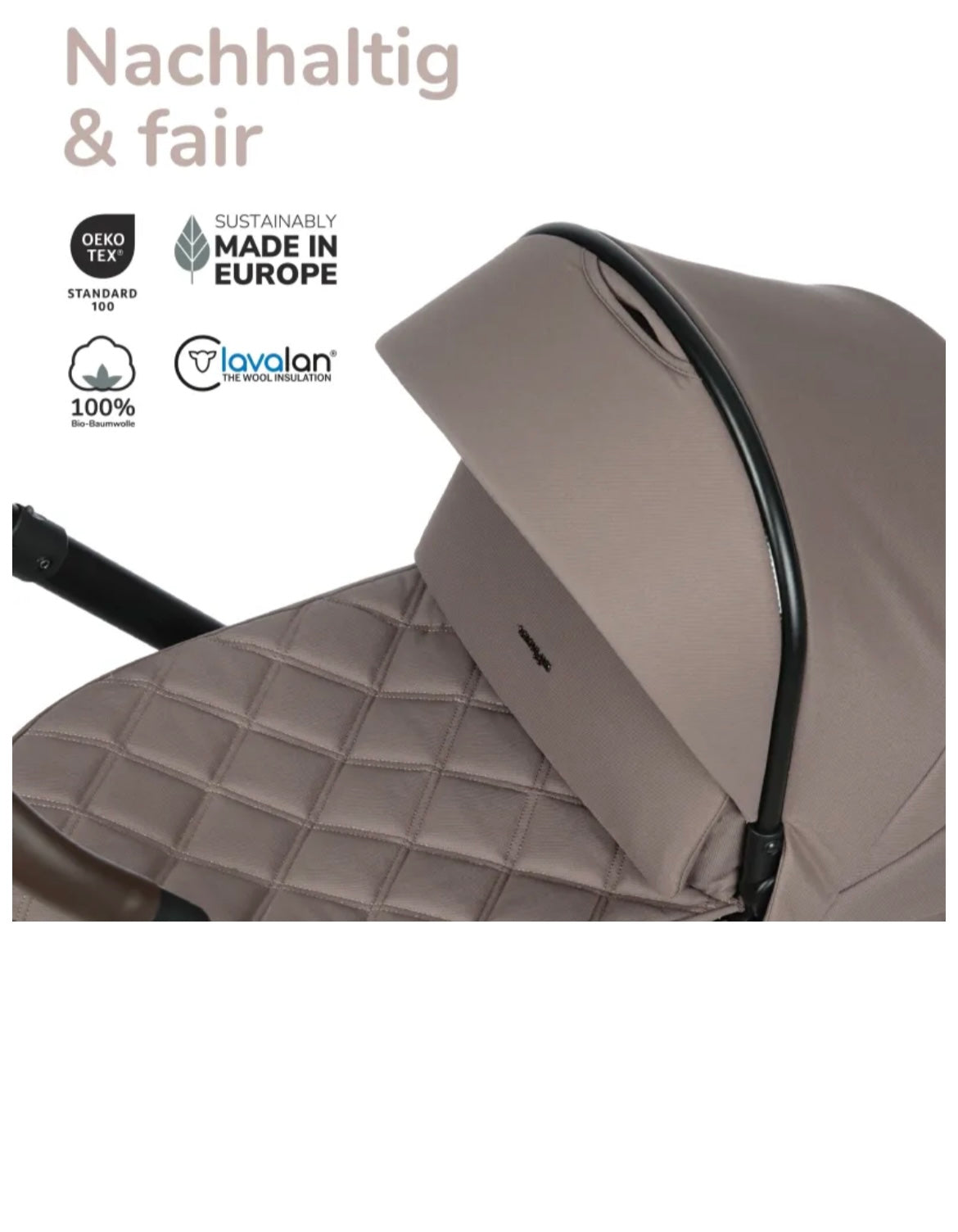 Auszeichnung: Alle am Kinderwagen befindliche Stoffe sind ÖkoTex zertifiziert, Bio-Baumwolle innerhalb der Babywanne und Dächer Innen: GOTS