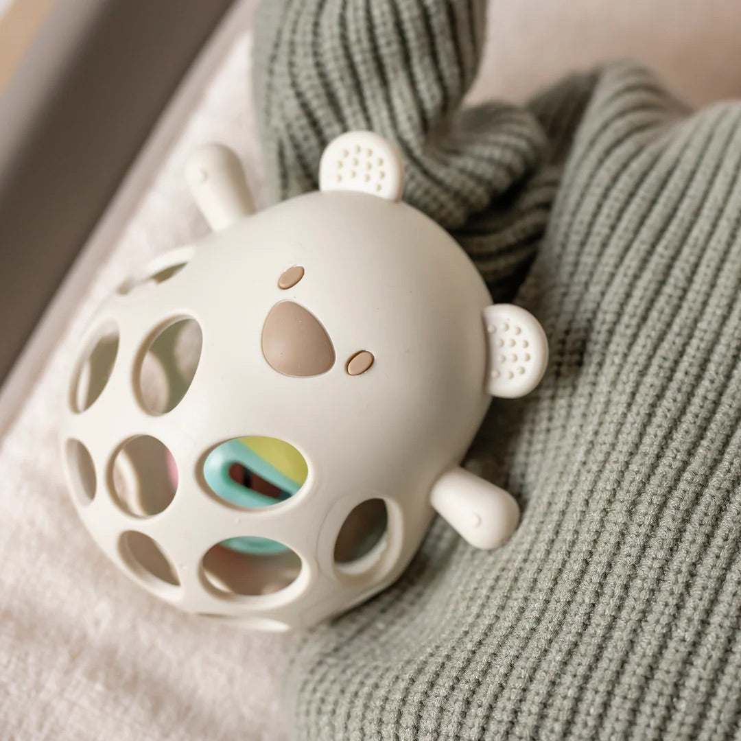 Der Silikonbär mit Ball sind Beißring und Rassel zugleich: Als weicher Beißring begleiten sie Babys und Kleinkinder durch die ersten Zähne. Die aufgeraute Oberfläche lindert zudem durch eine sanfte Massage des Zahnfleisches unangenehme Zahnschmerzen. Als Rassel - der bär hat die ideale Größe für kleine Hände und Finger. Die vielen Löcher, die einzelnen Elemente und die unterschiedlichen Texturen machen Spaß beim Spielen und fördern den Tastsinn. Der integrierte Ball im Inneren sorgt für zusätzliche akustische Stimulation und macht jedes Schütteln zu einem Erlebnis.
