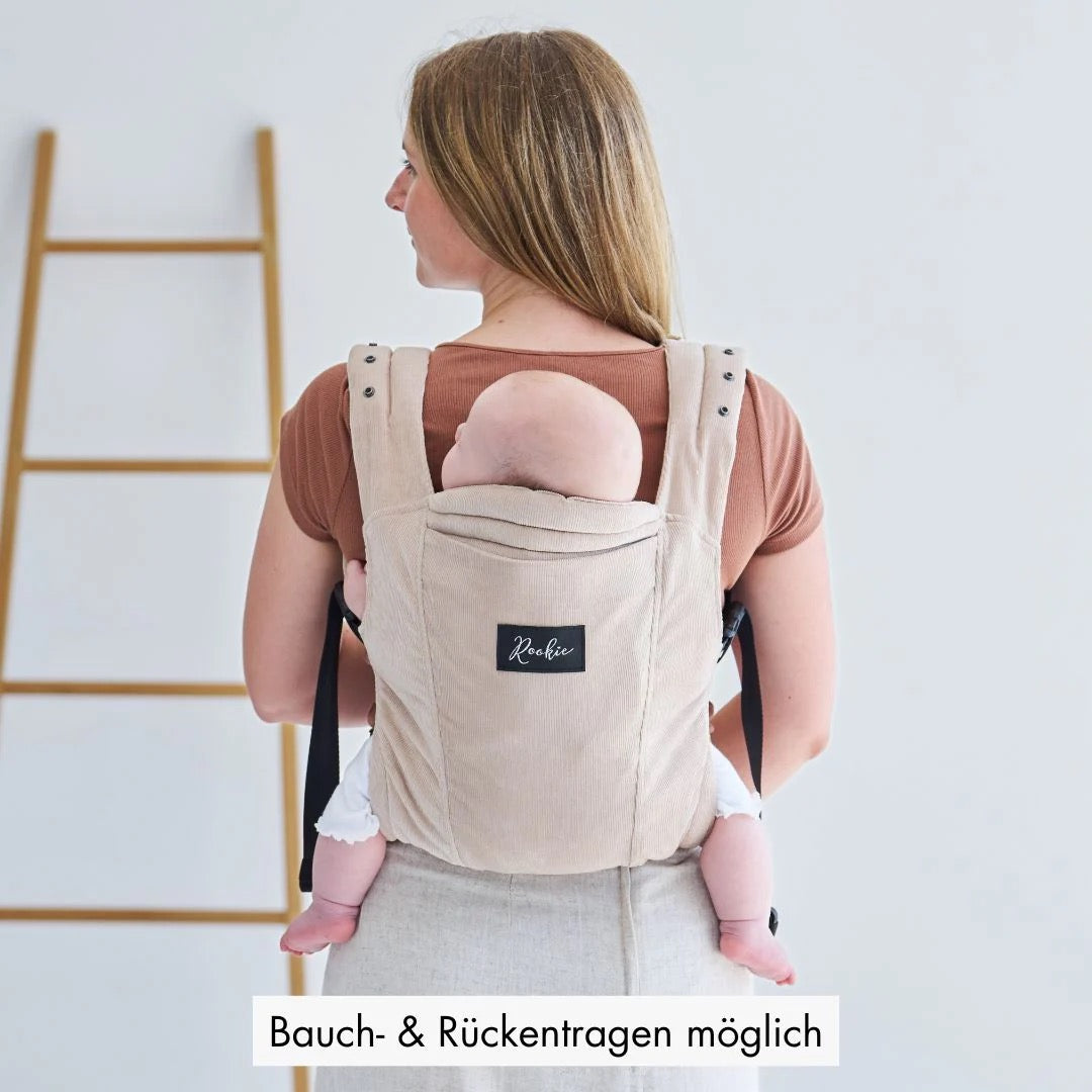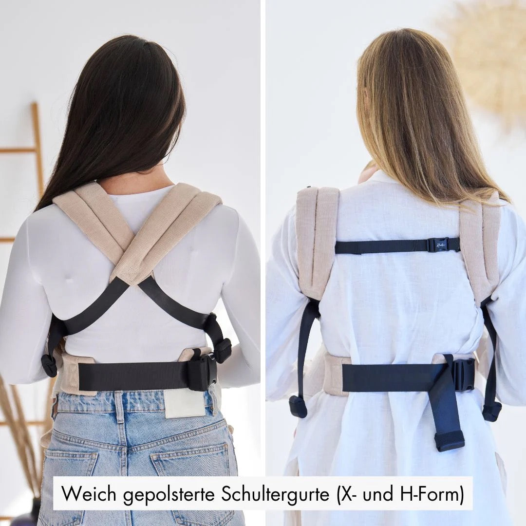Merkmale: Fullbuckle Babytrage, Bauch- und Rückentrage, Stufenlos verstellbarer Steg, gepolsterte Nackenstütze, verstaubare Kopfstütze zum Stillen & Sonnenschutz
