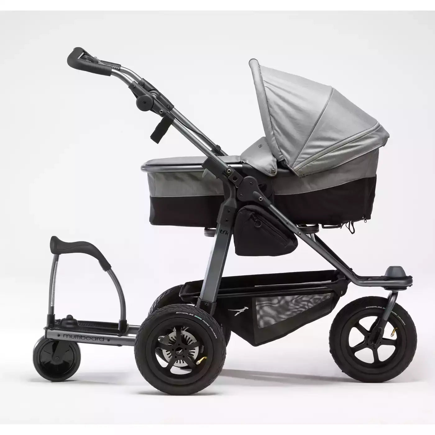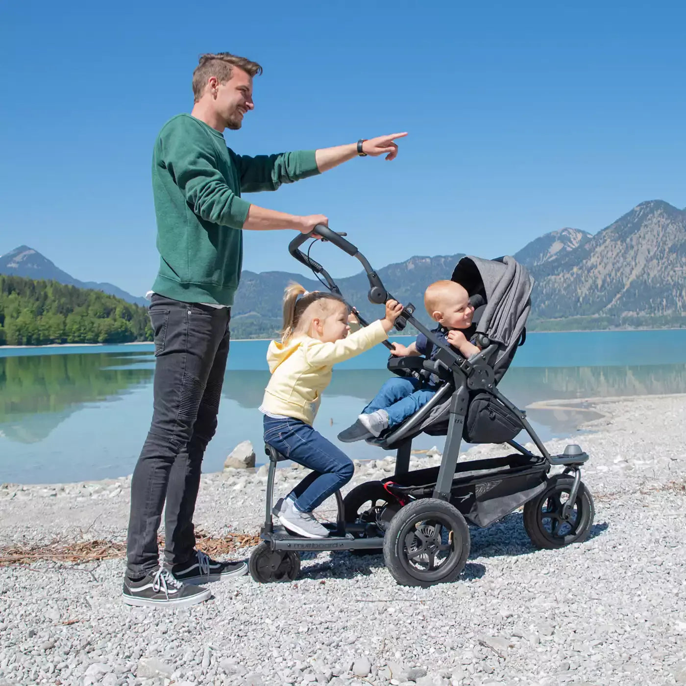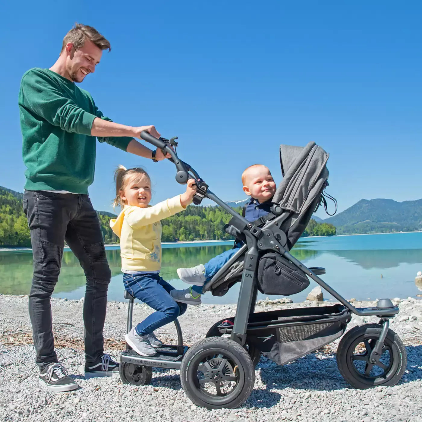 Hat der große Bruder bzw. die große Schwester mal keine Lust mehr zum Laufen? Dann ab auf das multiboard. Das Kind kann entweder stehen oder bequem sitzen. Und wenn das multi board nicht benötigt wird, dann kann es mit einem Handgriff entfernt werden. Passend für alle tfk mono Modelle.