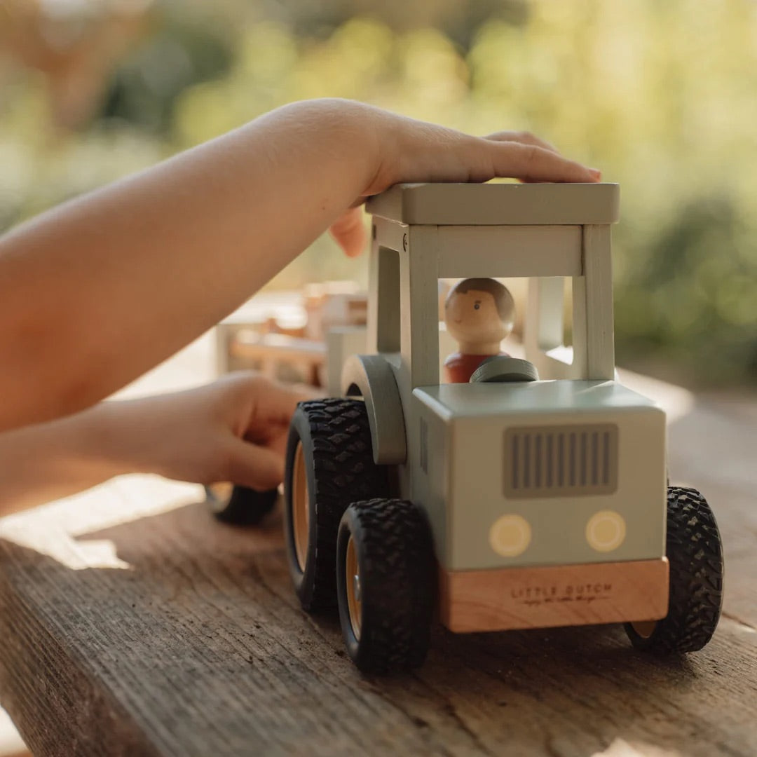 Vroom vroom, hier kommt der Traktor mit allen Tieren! Super lustiges Spielzeug, um die Fantasie deines Kleinen anzuregen. Neben den Tieren findest du auch zwei Milchflaschen im Anhänger. Bringe alles zum Bauernhof und deine Aufgabe ist erledigt. Alles ist aus Holz gefertigt, so dass es lange halten kann
